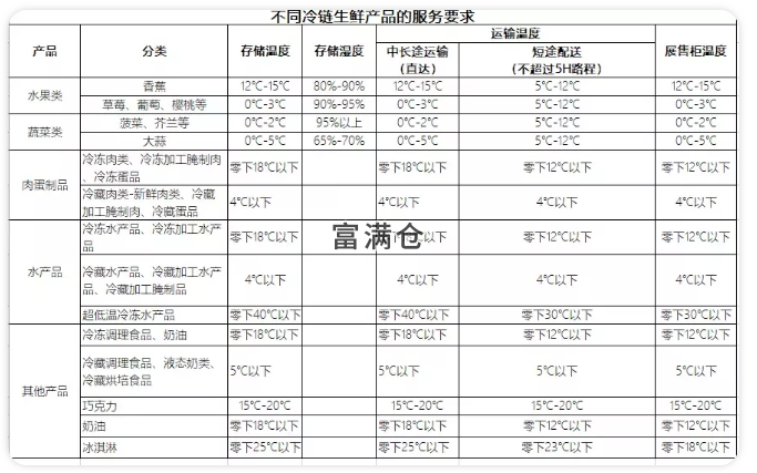 从表格中可以看出冷链供应链服务的产品分类众多,其中仅食品类就分为生鲜、冷冻、冷藏。其中有天