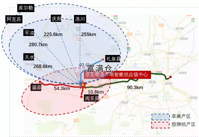 除了硬件过硬外,京东物流产地智能供应链中心区位优势也非常明显。从武功出发,向西北区域辐射,
